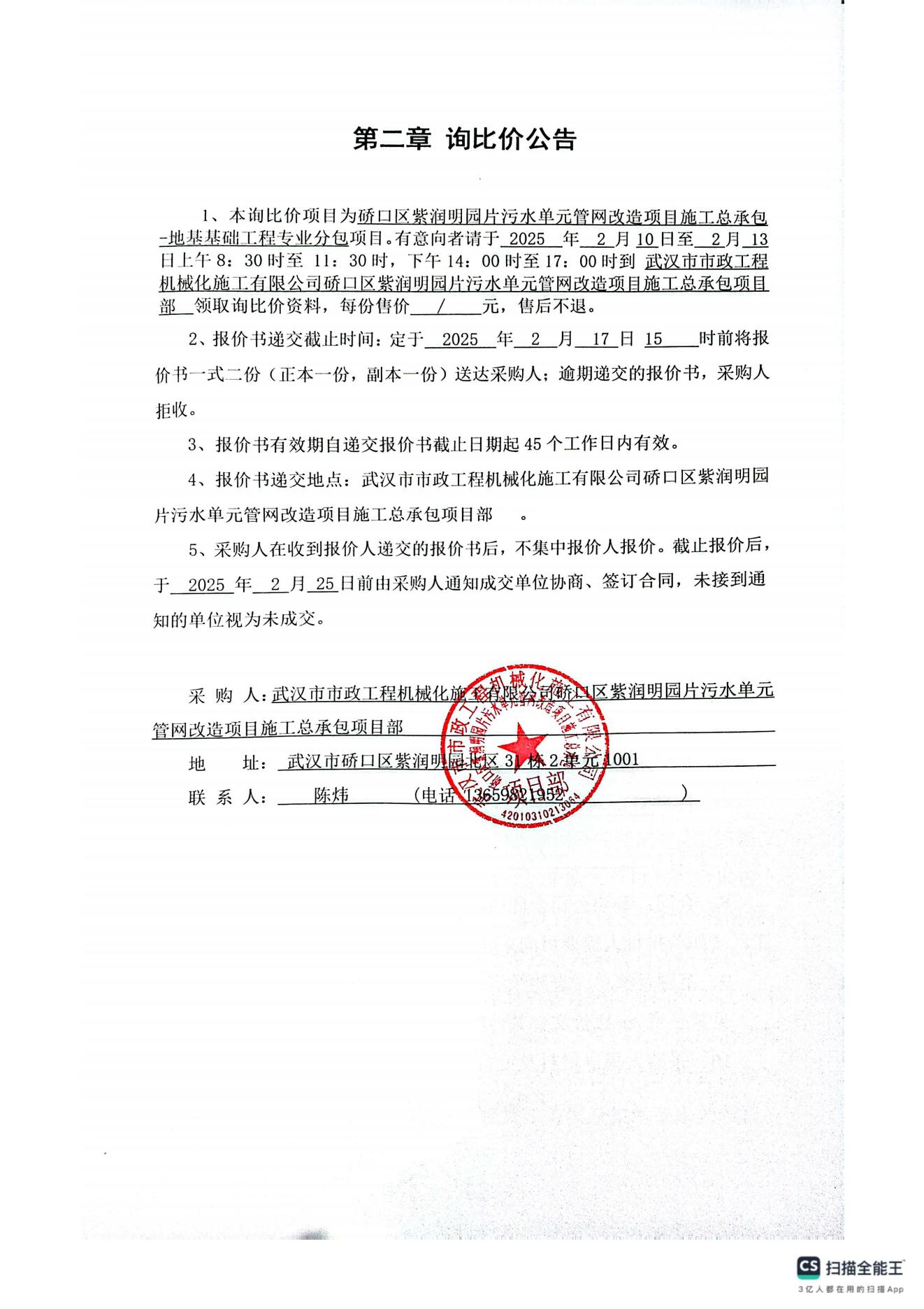 硚口區(qū)紫潤明園片污水單元管網(wǎng)改造項目施工總承包-地基基礎工程專業(yè)分包詢價公告
