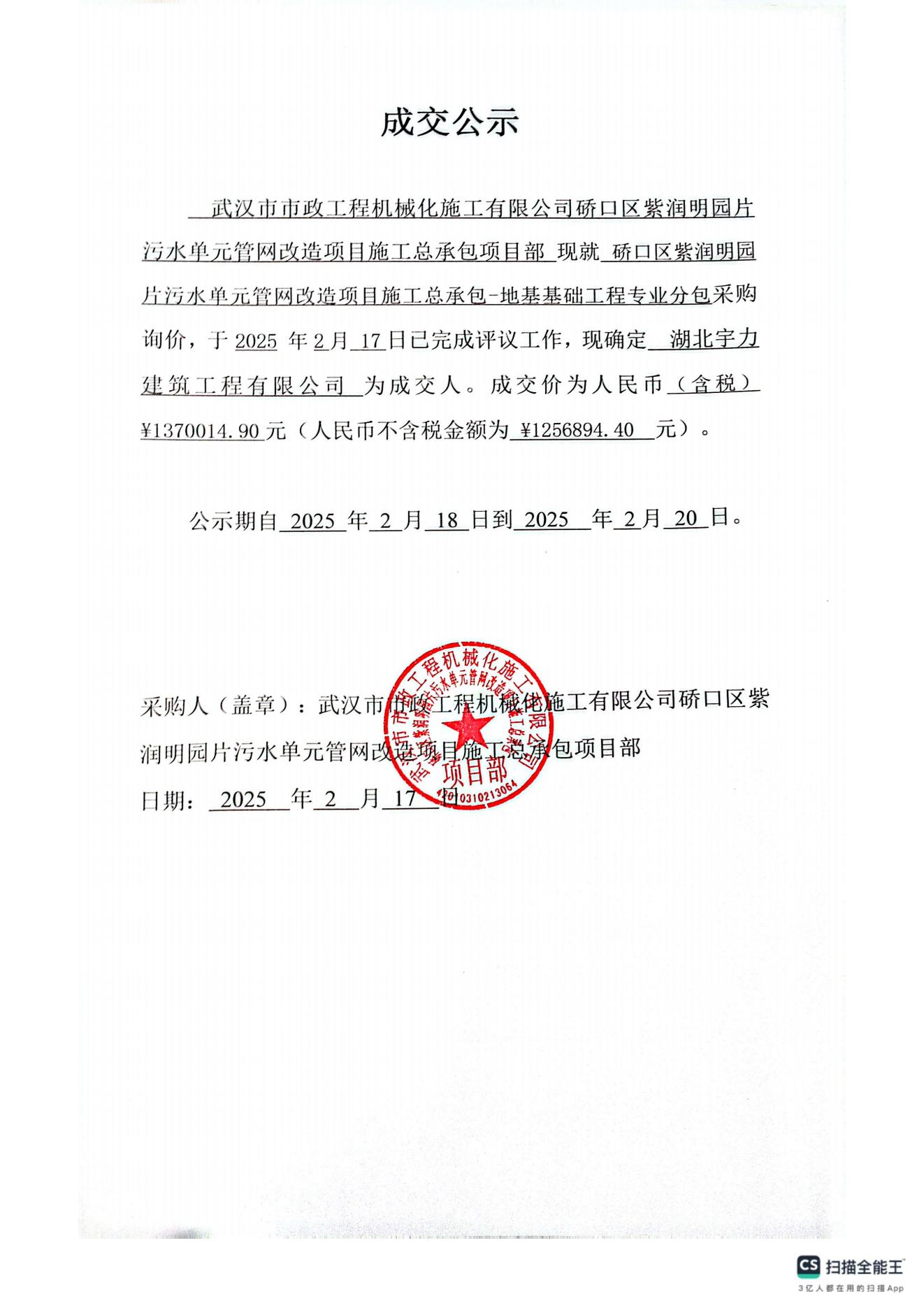 硚口區(qū)紫潤明園片污水單元管網(wǎng)改造項目施工總承包-地基基礎(chǔ)工程專業(yè)分包成交公示