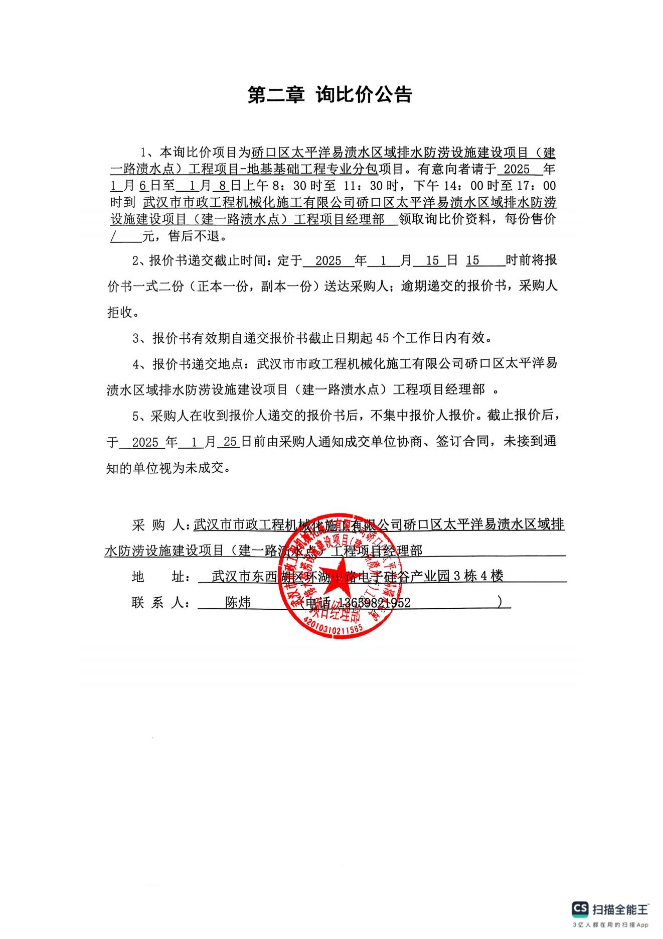 硚口區(qū)太平洋易漬水區(qū)域排水防澇設施建設項目(建一路漬水點)工程項目-地基基礎工程專業(yè)分包詢價公告