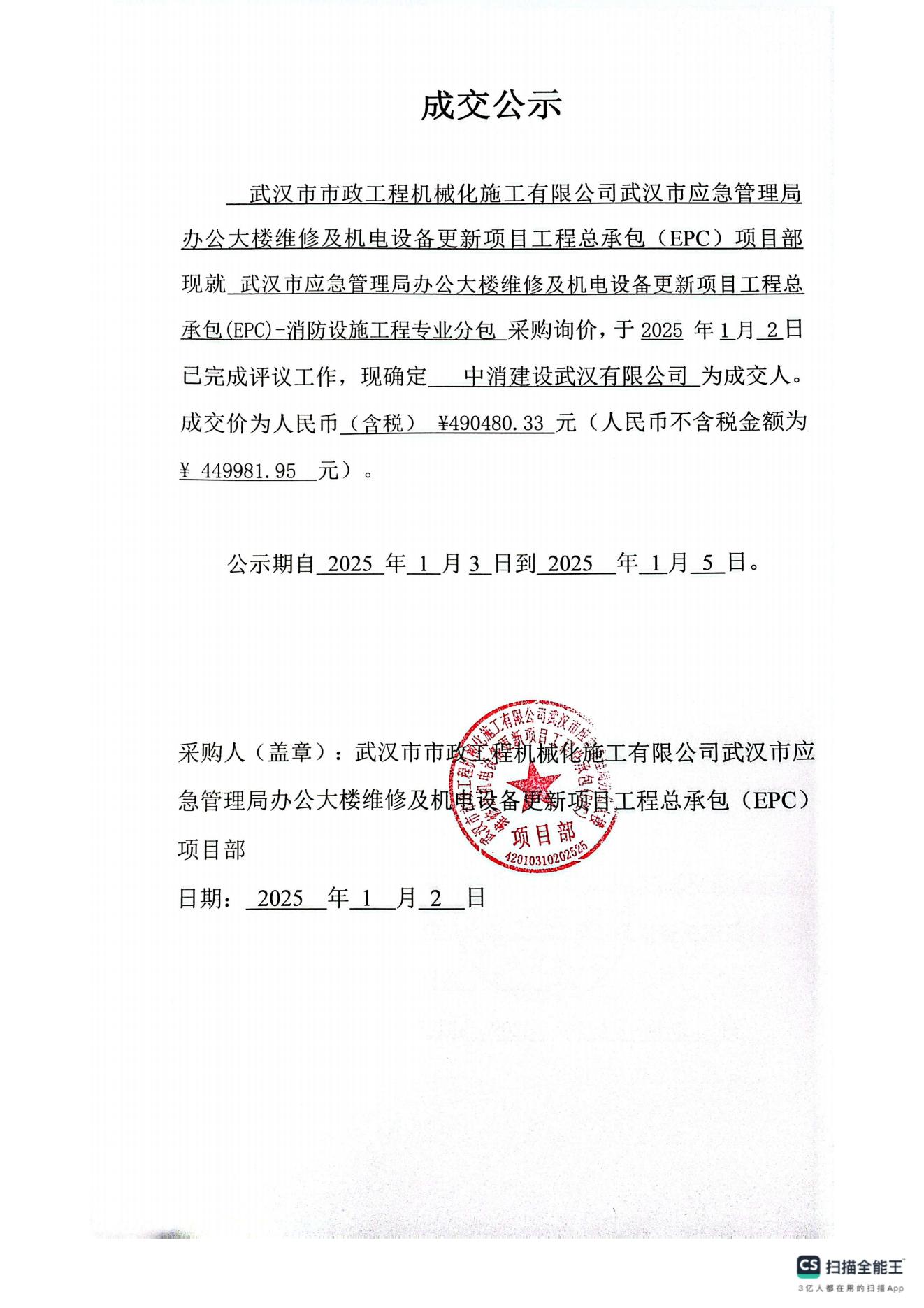 武漢市應(yīng)急管理局辦公大樓維修及機電設(shè)備更新項目工程總承包(EPC)-消防設(shè)施工程專業(yè)分包成交公示