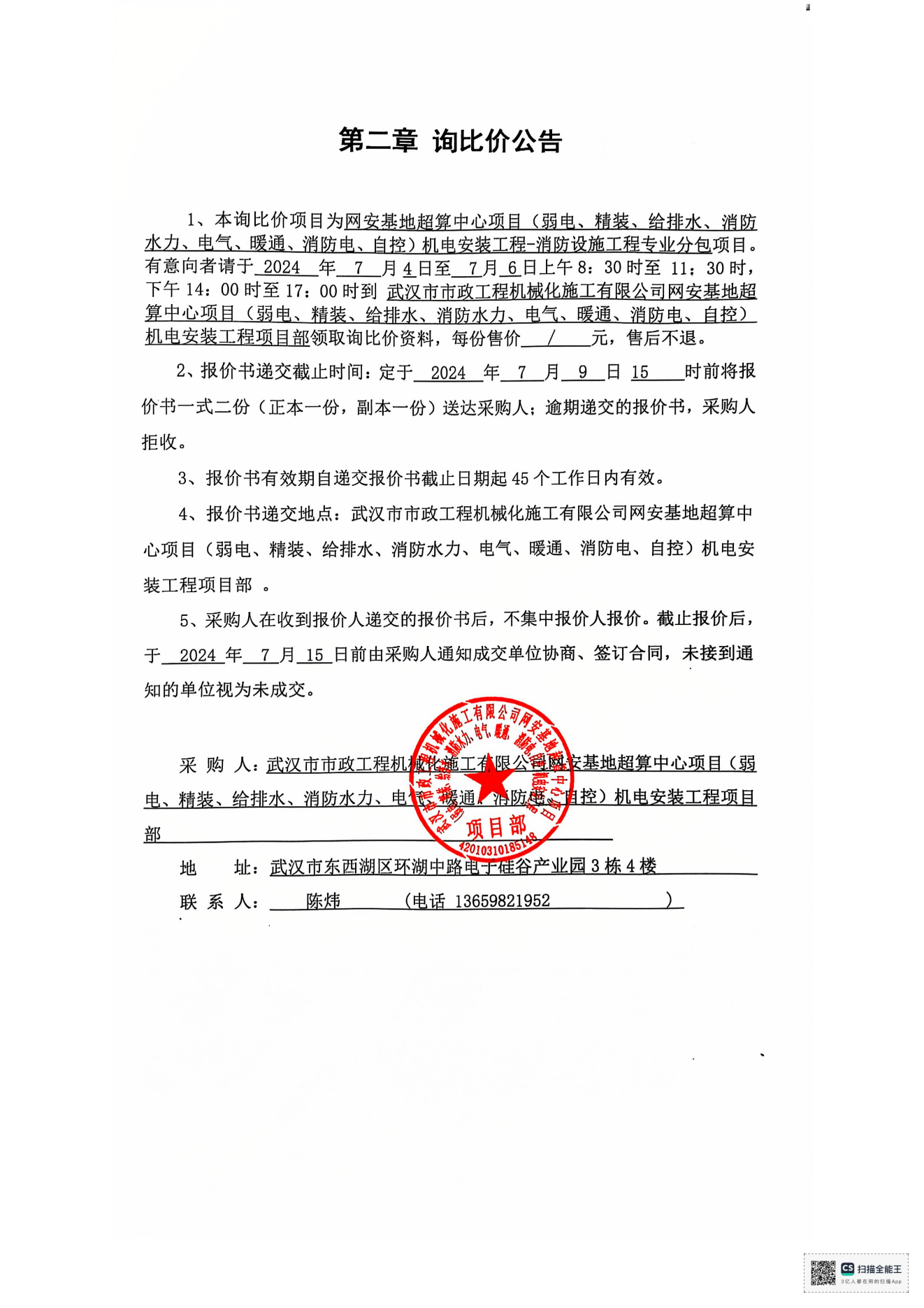 網(wǎng)安基地超算中心項(xiàng)目(弱電、精裝、給排水、消防水力、電氣、暖通、消防電、自控)機(jī)電安裝工程-消防設(shè)施工程專業(yè)分包詢價(jià)公告
