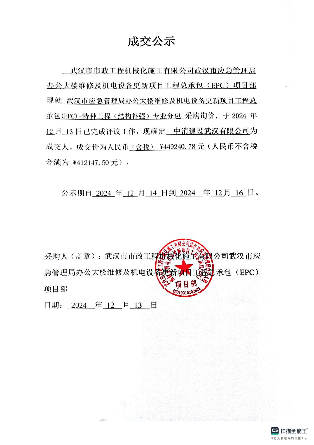 武漢市應(yīng)急管理局辦公大維修及機電設(shè)樓備更新項目工程總承包(EPC) -特種工程(結(jié)構(gòu)補強)專業(yè)分包成交公示